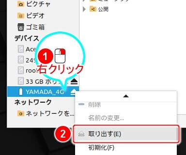 上図のようにPCにメディアを挿すとファイルマネージャが開きます。 ファイルマネージャの『場所』の一覧に対応する行が増えており、右端の三角マークをクリックすれば取り外すことができます。