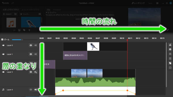 最終的に動画として出力されるのはタイムライン上にあるクリップです。 タイムライン上の各層に配置された各クリップが、上層のクリップが下層のクリップを覆い隠すように合成され、時間の流れに沿って出力されます。