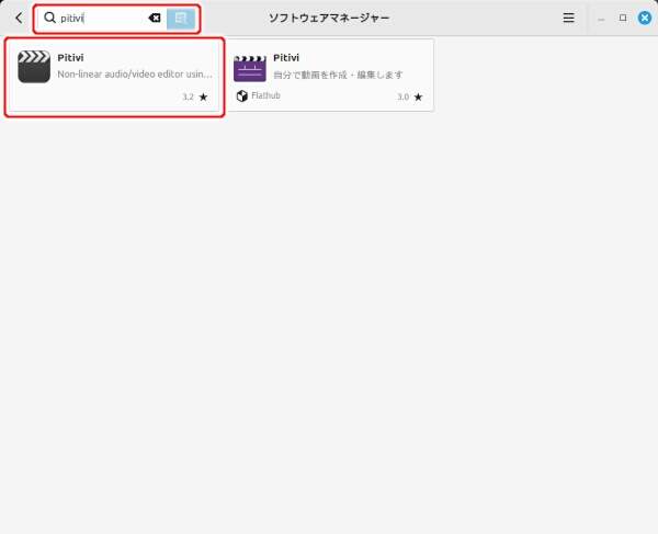 ソフトウェアマネージャーを開き、左上にある検索欄に "pitivi" と入力します。