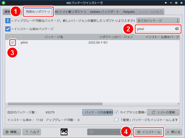 MX パッケージインストーラを開いて "有効なリポジトリ" タブを選択し、一覧の右上にある検索欄に "pitivi" と入力します。