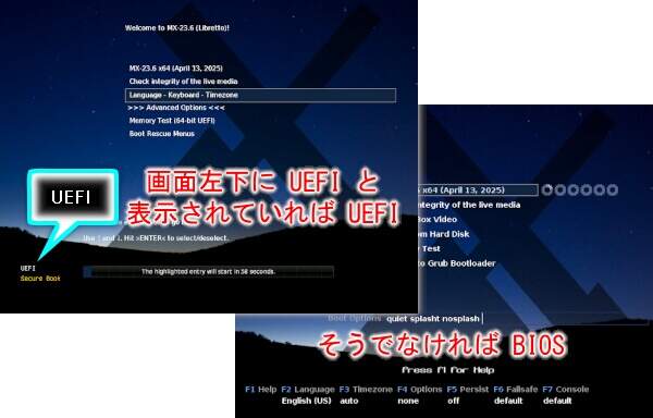 MX Linuxの起動に成功すると起動メニューが表示されます。 なお、PCのファームウェアインタフェースが UEFIかBIOSかで起動メニューは異なります。 それぞれ手順が異なりますので、お使いのPCに合わせて実施してください