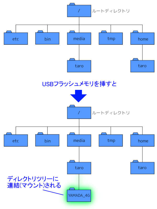 大丈夫、心配はありません。 UNIX系OSでは、USBフラッシュメモリや外付けハードディスクといった記録媒体が接続されると、ディレクトリツリーの一部として連結されます。 だから、ディレクトリツリーは1つで足りるのです。
